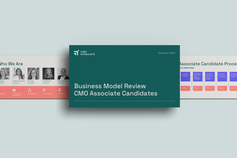 The CMO Syndicate, a coalition of experienced fractional CMOs, approached us with a common challenge: their bootstrapped logo and identity no longer suited their needs. They sought a forward-looking visual identity to win more clients by making a strong professional impression and to prove their concept to other CMOs as they expanded their network (or "braintrust"). Our solution centered on a clean logo design with embedded symbolism, featuring simple shapes showing upward motion and growth while representing CMO Syndicate's guiding influence on clients.